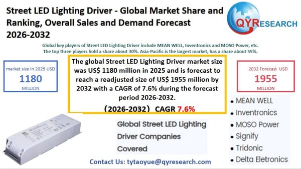 The global market for Street LED Lighting Driver was estimated to be worth US$ 1180 million in 2025 and is projected to reach US$ 1955 million, growing at a CAGR of 7.6% from 2026 to 2032.