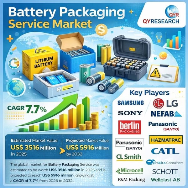 The global market for Battery Packaging Service was estimated to be worth US$ 3516 million in 2025 and is projected to reach US$ 5916 million, growing at a CAGR of 7.7% from 2026 to 2032.