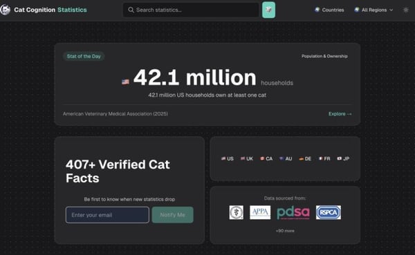 "I created this for my own blog and YouTube research--I got tired of hunting down reliable statistics scattered across academic papers and government reports," said Adam Gill, founder of Cat Cognition. "Once I had it all consolidated with proper citati