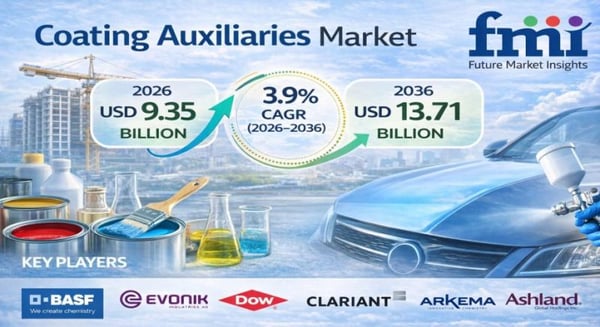 The global Coating Auxiliaries Market was valued at USD 9.0 billion in 2025 and is projected to reach USD 9.35 billion in 2026. According to analysis by Future Market Insights (FMI), the market is forecast to expand to approximately USD 13.71 billion by 2036, registering a CAGR of 3.9% during the 2026-2036 period.